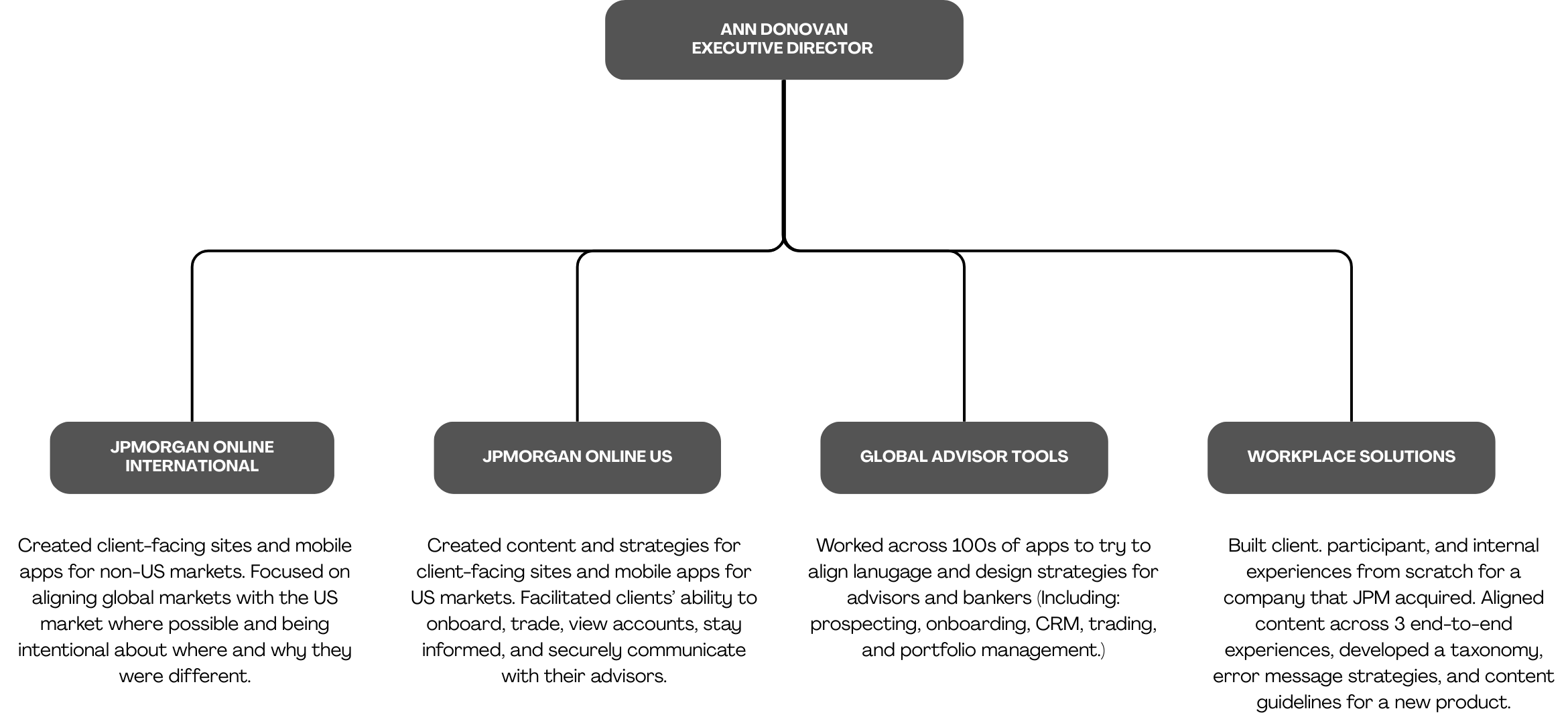 I started the first Content Design team at J.P. Morgan Global Private Bank, hiring designers across the globe to support the needs of advisors, clients, and institutions at the Bank.